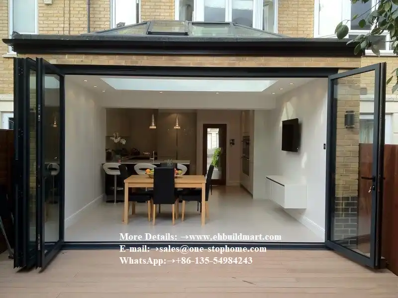 Modern Bi Fold Doors Grey Aluminium Profile Level Threshold Timber Decking Timber Floor Bifold Patio Doors House Extension Design Bifold Doors